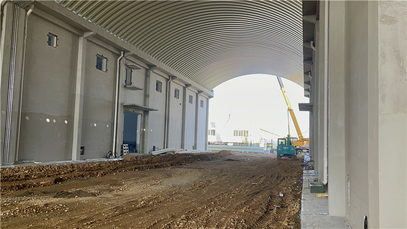 本次拱形波紋鋼屋面采用914-610型結構,拱跨18.10米,長度85.82米,總覆蓋面積超1500㎡。屋面選用冠洲品牌彩涂卷,厚度1.0mm,正面海藍色、背面灰白色,兼顧耐腐蝕性與視覺協調性。