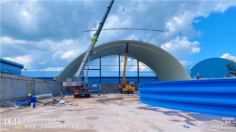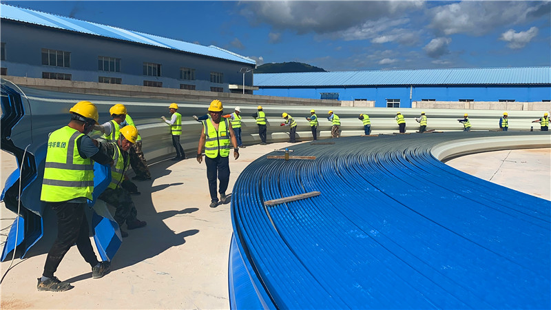 項目完工后,建設單位與業(yè)主單位聯(lián)合進行驗收,各項指標符合合同要求,施工結(jié)果獲得認可。拱形屋蓋安裝嚴密、排水順暢、結(jié)構(gòu)牢固,適應華新水泥料棚嚴苛的工業(yè)使用環(huán)境。