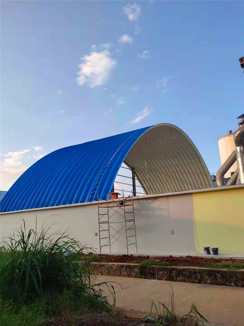 本項目采用跨度32米、長度66米的拱形波紋鋼屋蓋設計,拱高約10米,屋面結(jié)構(gòu)無需梁柱支撐,自成體系,適用于大跨度、重載荷的工業(yè)料棚。屋面使用厚度為1.4mm的高強度彩涂卷壓型成型,正面海藍色、底面灰白色,兼顧結(jié)構(gòu)性能與視覺效果。