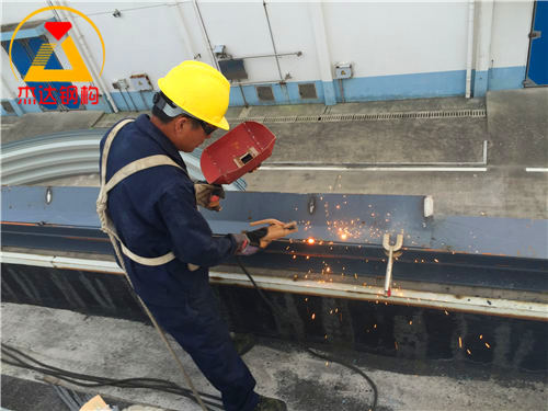 拱形屋頂下部的H鋼構件在安裝時需要進行拼接,以保證整體結構的穩定性和承載能力。拼接過程需嚴密對接,確保連接牢固,避免出現焊接缺陷。圖中所示為江蘇杰達鋼結構工程有限公司在福建長樂直屬庫制作的16米跨度項目現場實拍,展示了H鋼的精準拼接細節。