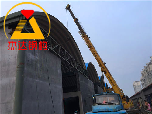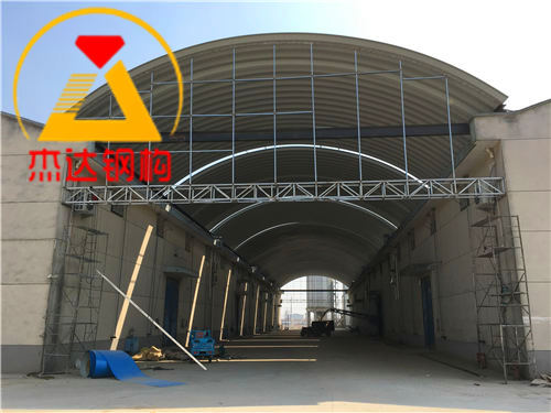 在山東濰坊十甲農貿市場的拱形屋頂工程中,采用了在原有方管桁架基礎上搭建框架山墻的方式。這種結構利用現有的桁架或圈梁,通過上支管架進行立框架支撐,具有結構整合的優勢。