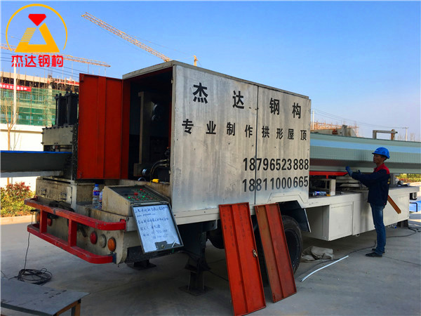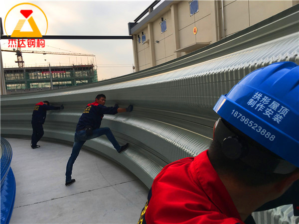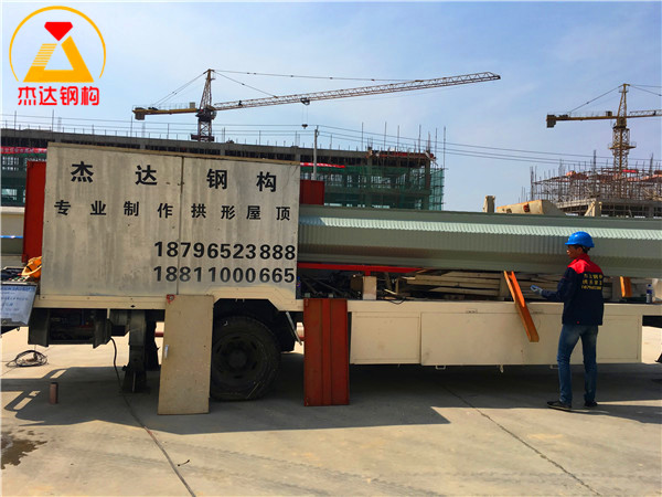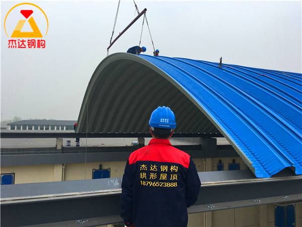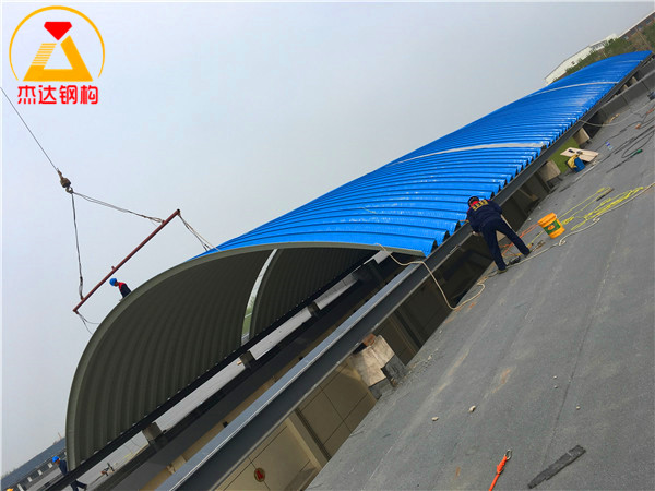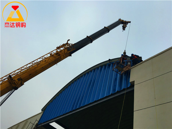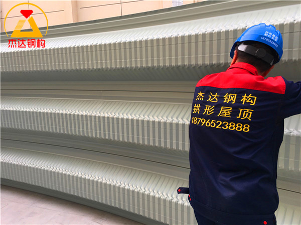 本次工程由杰達鋼構團隊全面負責,包括拱形屋頂的壓型制作與安裝作業,三道通長采光帶的布局,以及兩側山墻瓦的壓型安裝等關鍵環節。施工過程規范,工期緊湊,自2024年4月2日正式開工,于4月14日順利竣工。
