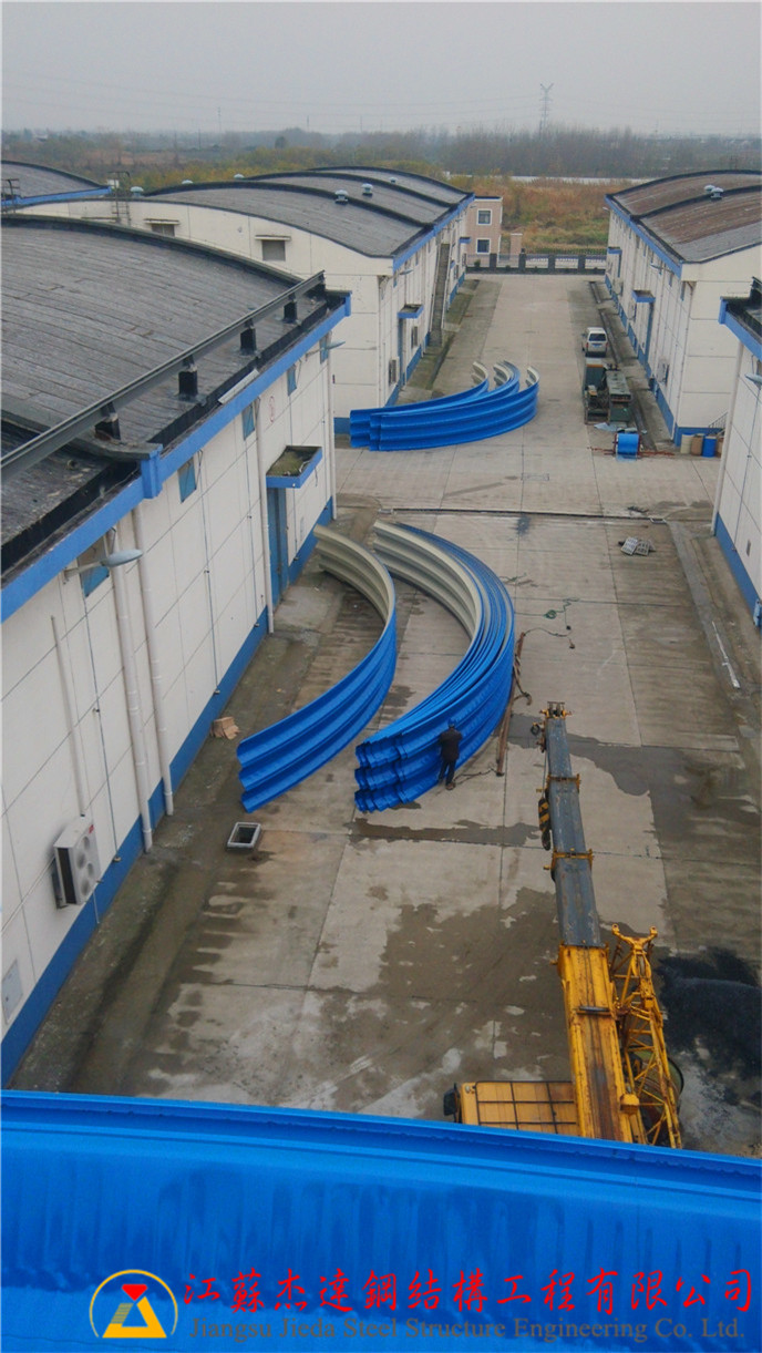 江蘇杰達鋼結構工程有限公司承建的過道式拱形屋頂,主要用于堆放物料和設備。該結構設計能夠在陰雨天氣下為糧食儲備庫提供良好的保護環境,確保設備和物資的安全存放與使用。