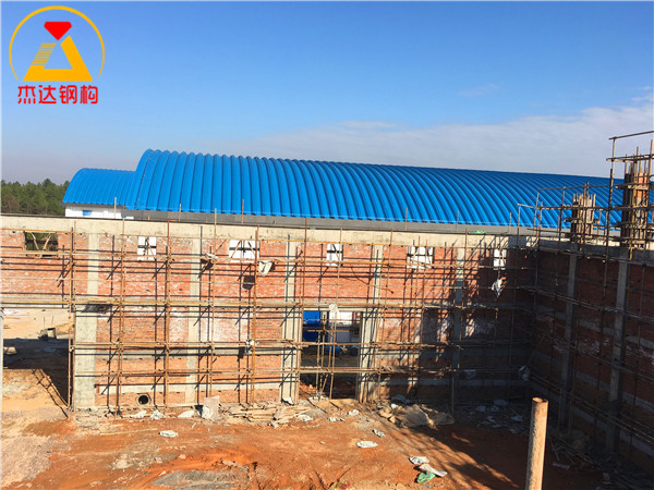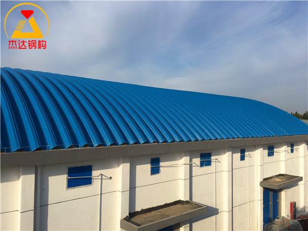 本項目的拱形屋頂跨度達到24米,總長度約為114米,分為兩棟建筑,一棟長度約為52米,另一棟約62米。屋頂采用了1.2毫米厚的海藍色彩涂卷板,這不僅增強了屋頂的防腐蝕性能,還提升了整體的美觀度。